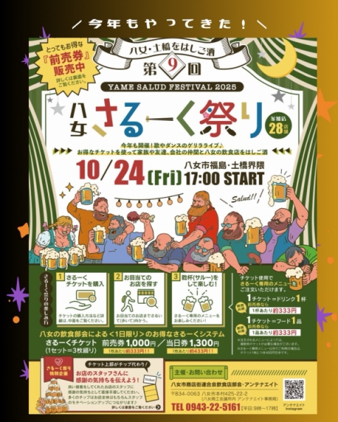 10月24日(金)、八女市福島・土橋界隈で「第9回 八女さるーく祭り(YAME SALUD FESTIVAL 2025)」が開催されます!今年もバル&キッチンSoLは参加店のひとつとして、皆さまをお迎えします😊