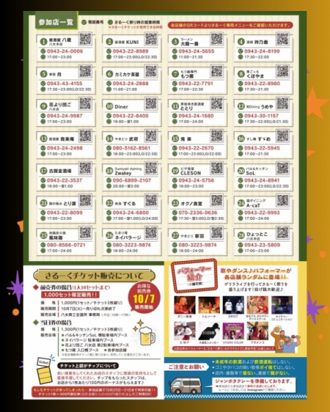 イベント当日は、前売券1,000円(3枚綴り)または当日券1,300円で「さるーくチケット」をご購入いただき、参加店舗を自由に“はしご酒”できます🍻 チケット1枚につきドリンク1杯またはフード1品が楽しめるので、家族やお友達、会社の仲間と一緒に八女の飲食店巡りを満喫してください!